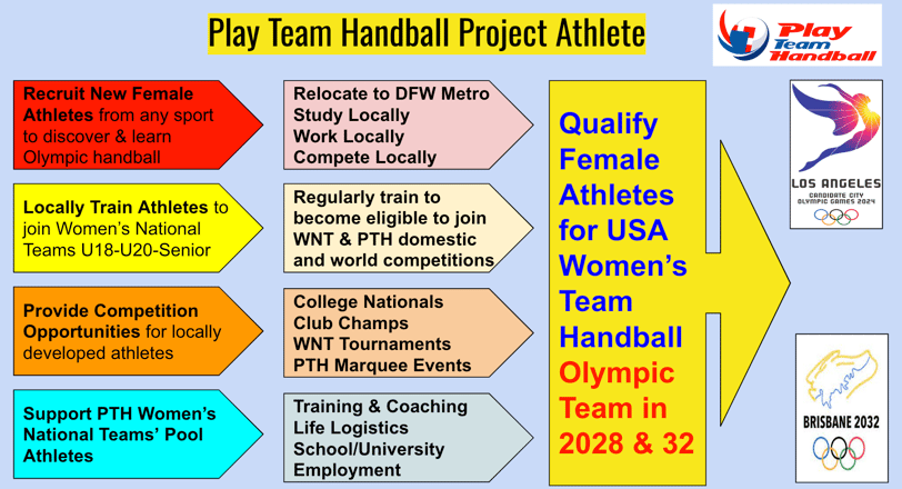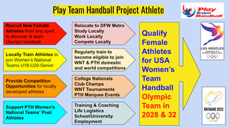 The Play Team Handball mission is to break all barriers for female athletes to discover, train, and compete in the Olympic handball in the US. To help our Women's National Teams regain a competitive edge in our North American hemisphere by 2028, we strategically either began already or plan to launch four (4) local Dallas-Fort Worth initiatives:
